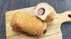 みんなが大好きな、お総菜パンの定番。こだわりのパン生地で、ポークウインナーを包んで揚げました。パン生地をウインナーに巻いていくのは、とても難しいですが、利用者様が一生懸命、愛情をこめて、一つ一つ巻いています。間食やおやつにも最適です。