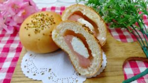 パンを口に入れると、ほんのり塩味のある桜の風味がふわっと立ち上がり、やさしい甘さの桜あんが口の中でなめらかに広がります。そこにクリームチーズのコクとほのかな酸味が重なり、甘さを引き締めて後味をスッキリとまとめてくれます。桜あんに和の甘みと、チーズの用のコクがバランスよく溶け合います。パンの上の砕いたピスタチオが香ばしいアクセントになっております。一足先に春を感じることができる一品となっております。
